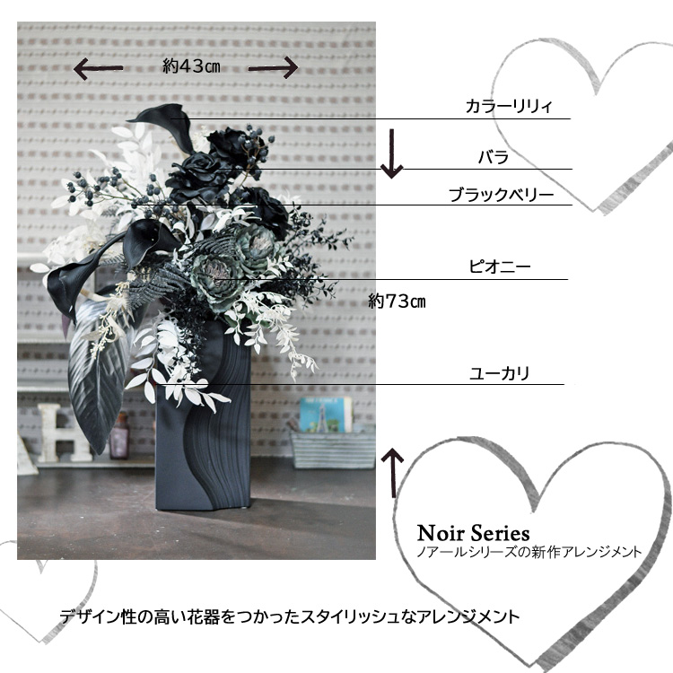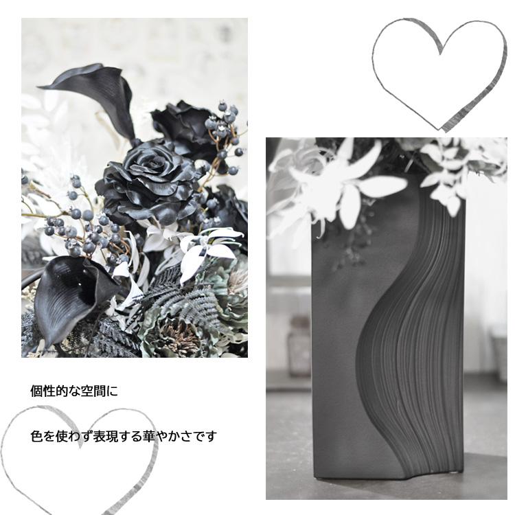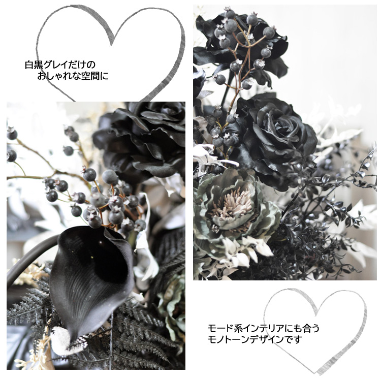 黒白グレイのモノトーンカラーだけで仕上げた上品なアーティフィシャルフラワーアレンジメント