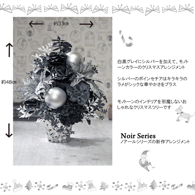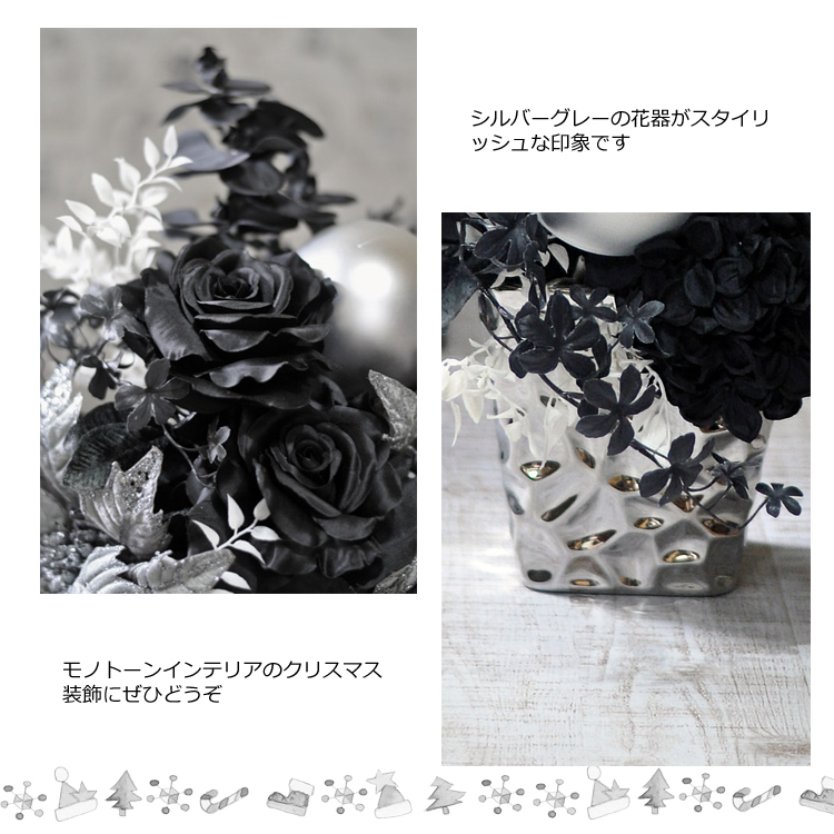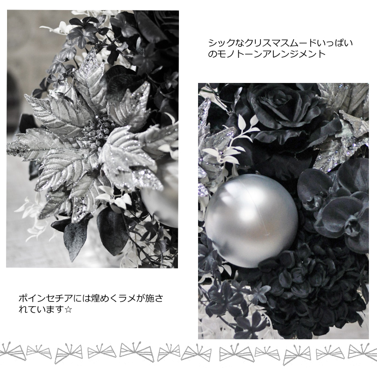 黒白グレイのモノトーンカラーだけで仕上げた上品なアーティフィシャルフラワーアレンジメントのクリスマスバージョン☆