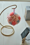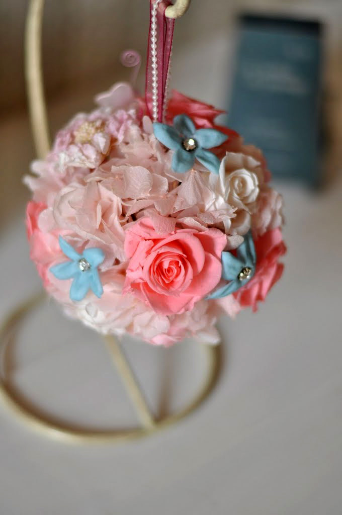 まんまるい可愛いフォルムのボールアレンジです。 フェミニンカラーのローズとブルージャスミンにはかわいい蝶々がとんでいます。