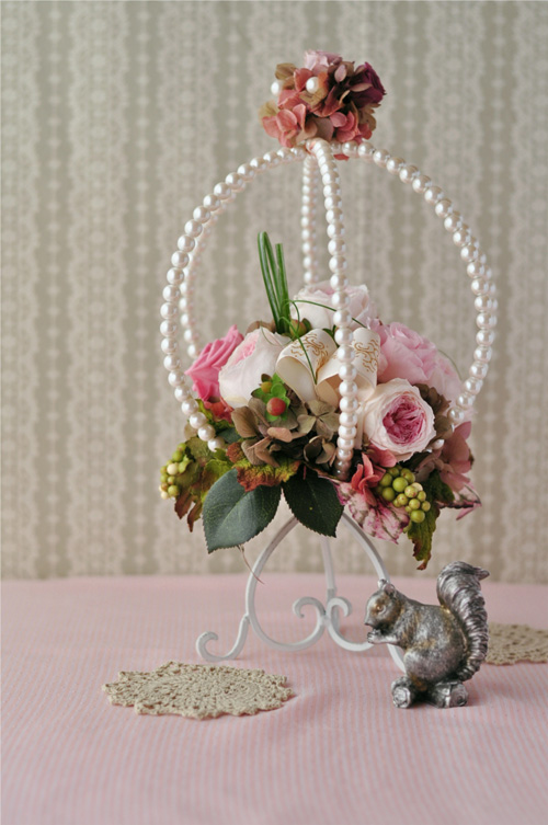 パールビーズの籠の中に数種類のピンクローズをアレンジしました。