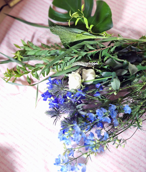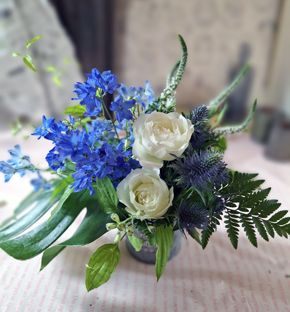 今回はブルーのお花としてデルフィニウムを使いましたが、ブルースターやブルーレースフラワーなどでもOKです。動きのあるグリーンをつかって、軽やかなアレンジメントをつくりましょう。 |