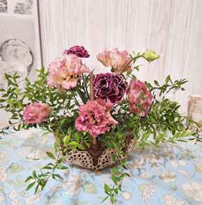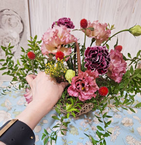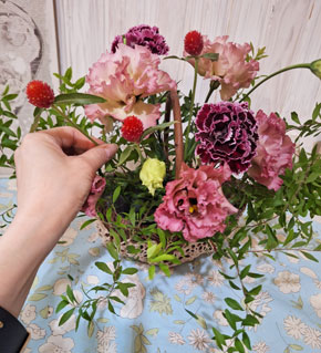 秋のシックな花をバスケットでナチュラルに仕上げました。動きのあるグリーンは飛び出すように長くいれたり、低く沈めたりして効果的に使いましょう |