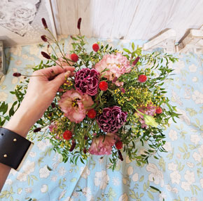 完成です 秋の花材をうまく入れて、大きくふんわりと軽やかなアレンジメントにしあげましょう |