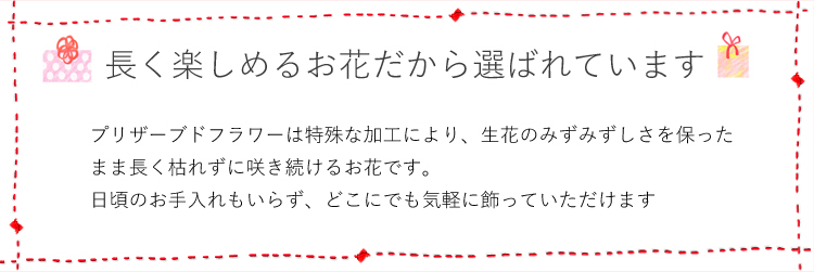 生花ではありませんので水やりの必要はありません。高温多湿・直射日光を避けて飾ってください。 |