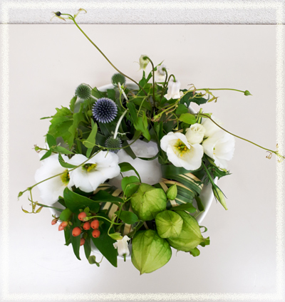 lessonでは、涼し気なテーブルフラワーのアレンジメント(生花)です。