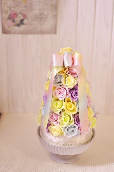 パステルカラーのローズをマカロンタワーみたいにアレンジした、とってもかわいいローズタワーです![]()