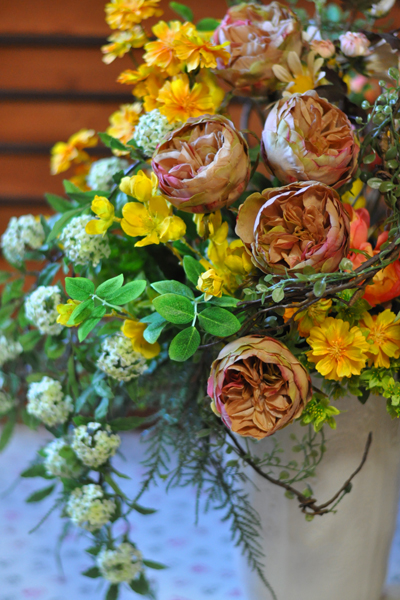 シックなモーブピンクのオールドローズとコデマリやヤマブキなどのナチュラル感たっぷりの花を合わせた豪華なアレンジメント。