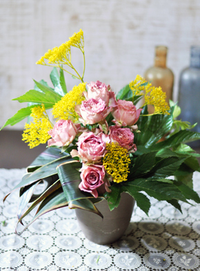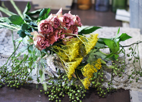 バラ、オミナエシ、ケイトウ、ユリ、野バラの実、ドラセナ 木苺、コバンソウなど |
