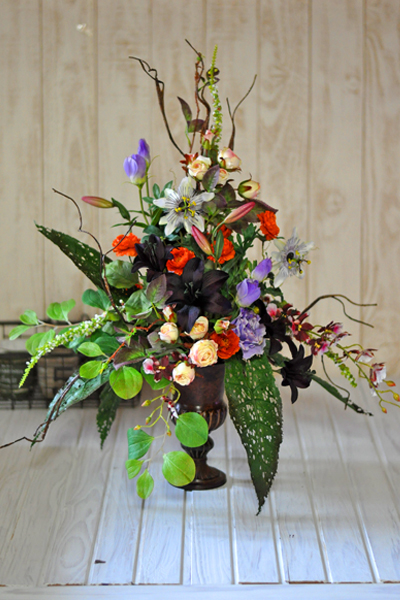 大きく振り出した枝物や和の花材で、クラッシックなフォルムの重厚感のあるアレンジメントです。