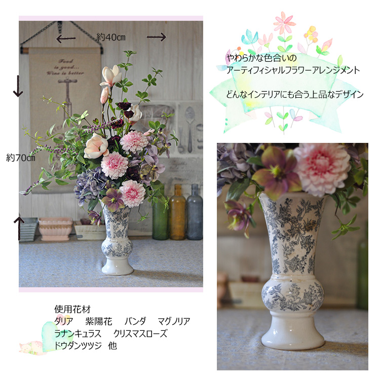 やわらかな色合いと繊細なフォルムが魅力のアーティフィシャルフラワーアレンジメント
