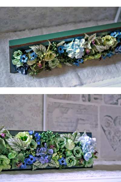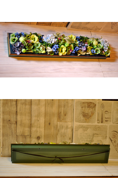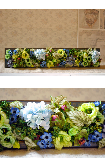 爽やかなブルーとグリーンのアーティフィシャルフラワーを取り合わせた、豪華なフレームアレンジメント。