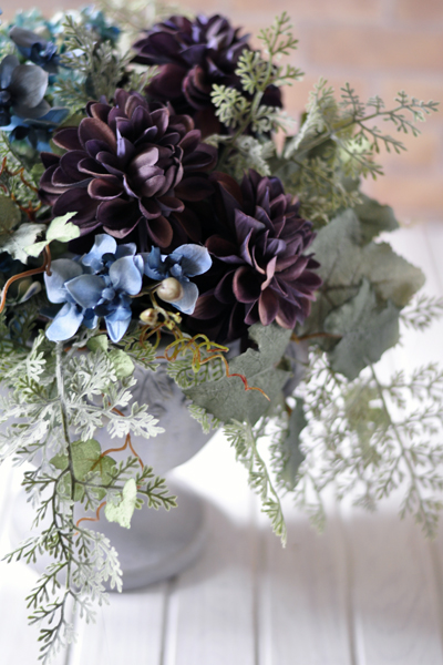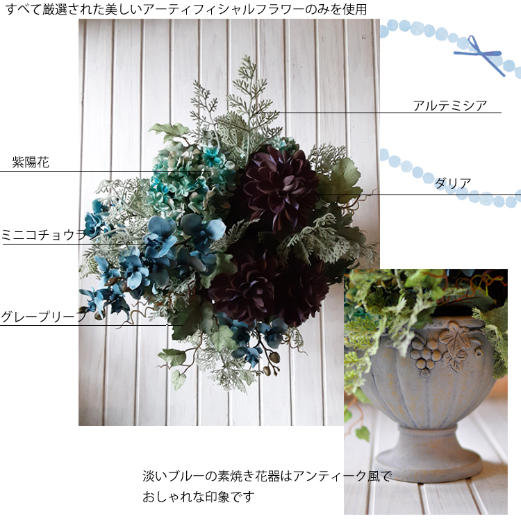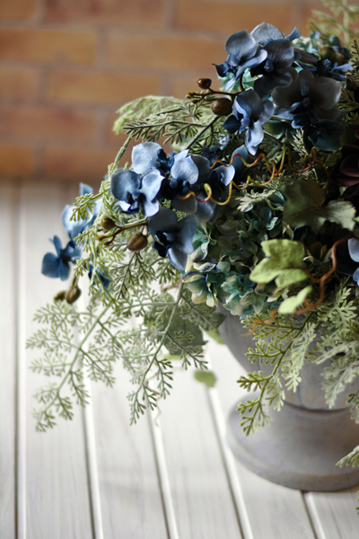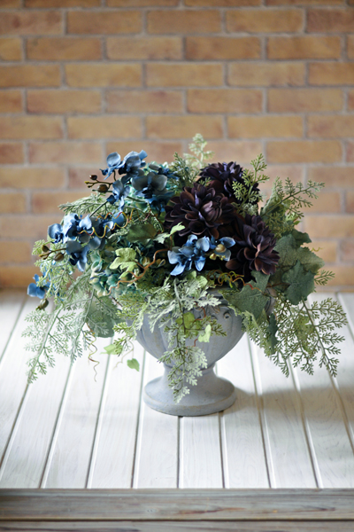 淡いブルーの素焼き花器に合わせたのは、ブルーとダークパープルのアーティフィシャルフラワーアレンジメント。