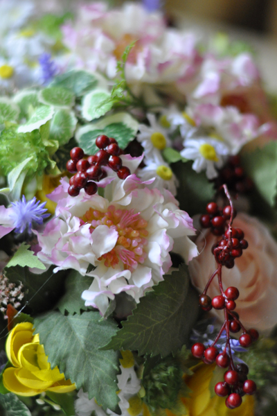 野の花ブーケ風の可愛いアレンジメント。まるで本物と間違うほどにリアルなアーティフィシャルフラワーを厳選しています。