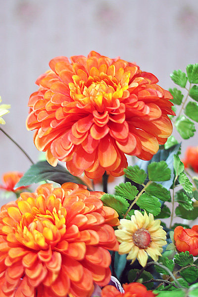 鮮やかなオレンジ色の大輪のダリアを中心に、優しい色合いのスモールフラワーと紫の胡蝶蘭を合わせてアレンジメントしました。
