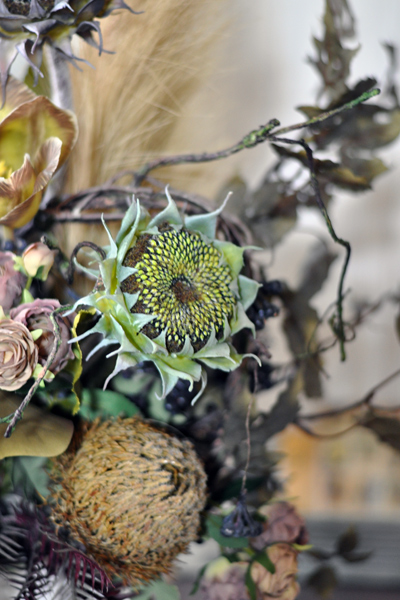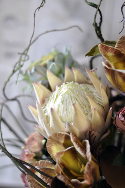 まるでドライフラワーのように繊細な色合いのアーティフィシャルフラワーアレンジメント。
