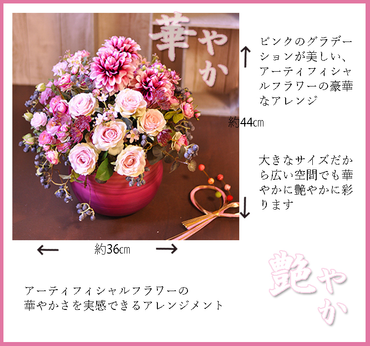 鮮やかなピンクを集めた、アーティフィシャルフラワーの華やかなアレンジメント。 大輪のダリアを中心に、バラ・ラナンキュラスなど数種類の花をアレンジしています。 グラデーションカラーの和テイストな花器が和風のインテリアにもしっくりとなじむデザインです。