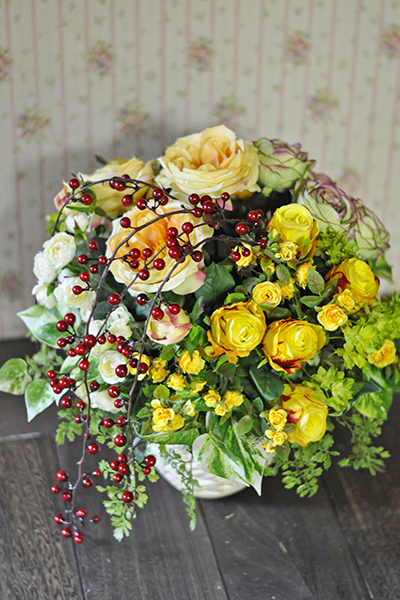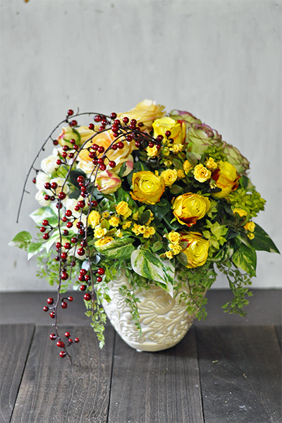 数種類のイエローローズを集めて豪華に鮮やかにアレンジメントしています。