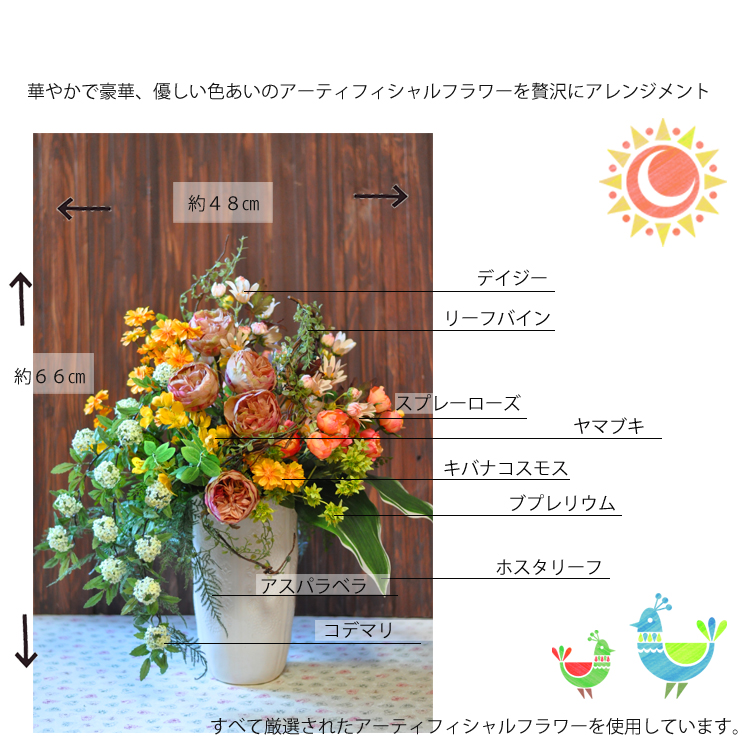 | 商品の色は掲載写真と多少異なる場合がございます。 生花ではありませんので水やりの必要はありません。高温多湿・直射日光を避けて飾ってください。 |
