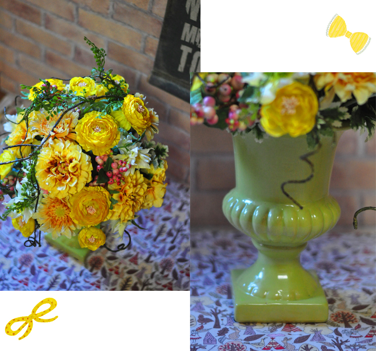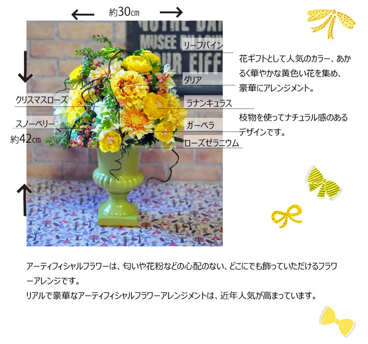 あざやかな黄色い花を集め、華やかに明るくアレンジした、アーティフィシャルフラワーアレンジメント。