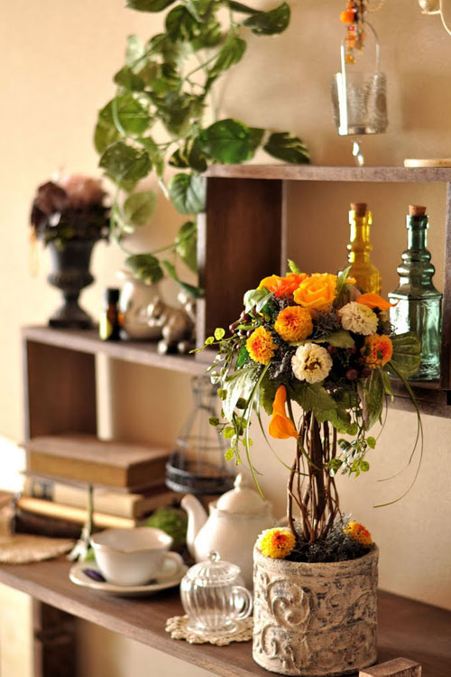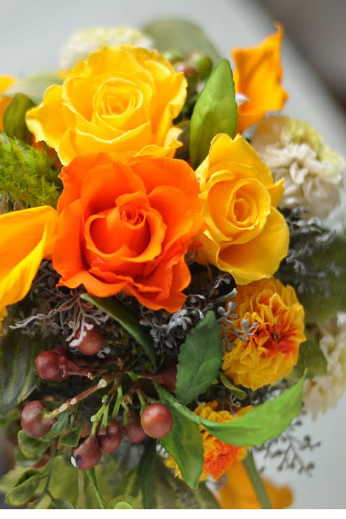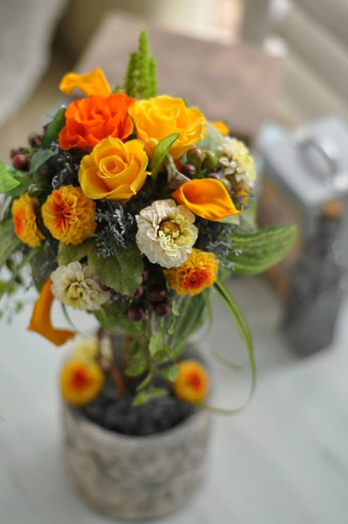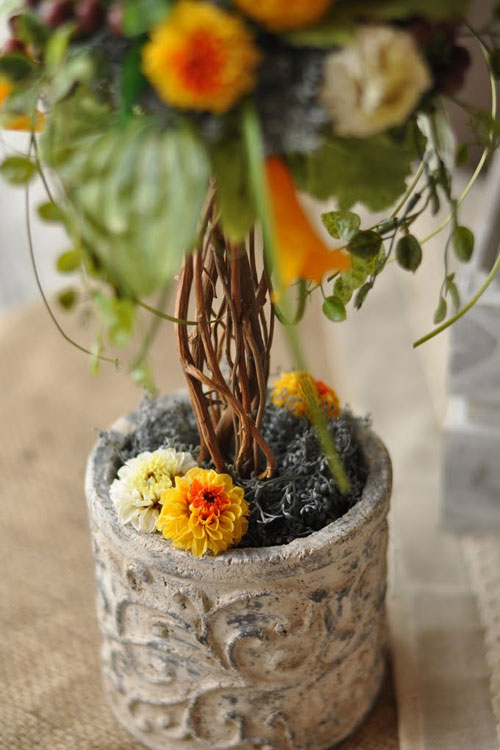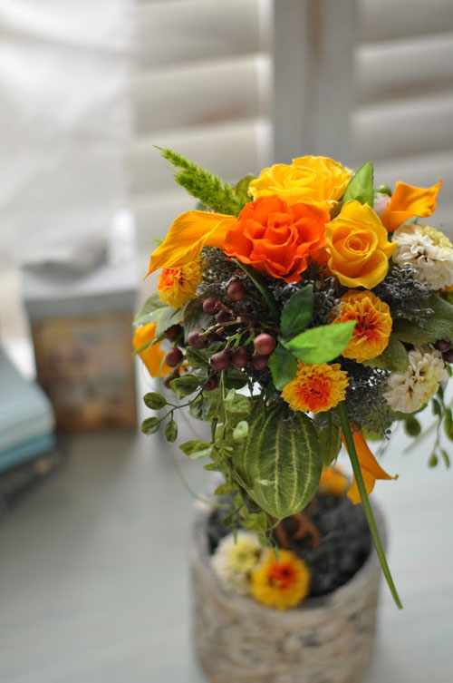 ビタミンカラーのイエロー&オレンジでとてもさわやかな色合わせのローズとミニダリアのトピアリーです。