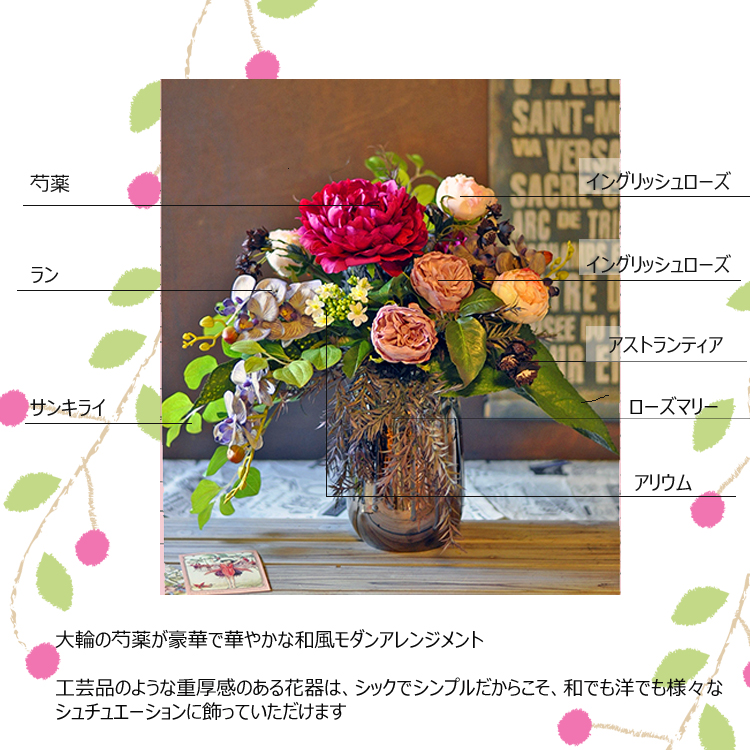 大輪の芍薬が豪華で華やかな、アーティフィシャルフラワーの和モダンアレンジメント。 重厚感のある花器に優雅にデザインされ、落ち着いた色合いのアレンジメントは、和の空間にも飾っていただきたい和風テイストなアレンジメントです。