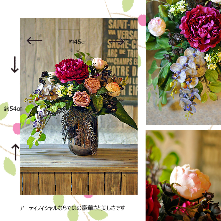 | 商品の色は掲載写真と多少異なる場合がございます。 生花ではありませんので水やりの必要はありません。高温多湿・直射日光を避けて飾ってください。 |