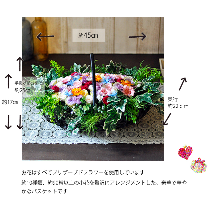 可愛い小さなプリザーブドフラワーをカゴいっぱいにつめ込んで、ナチュラルで贅沢なバスケットアレンジメント