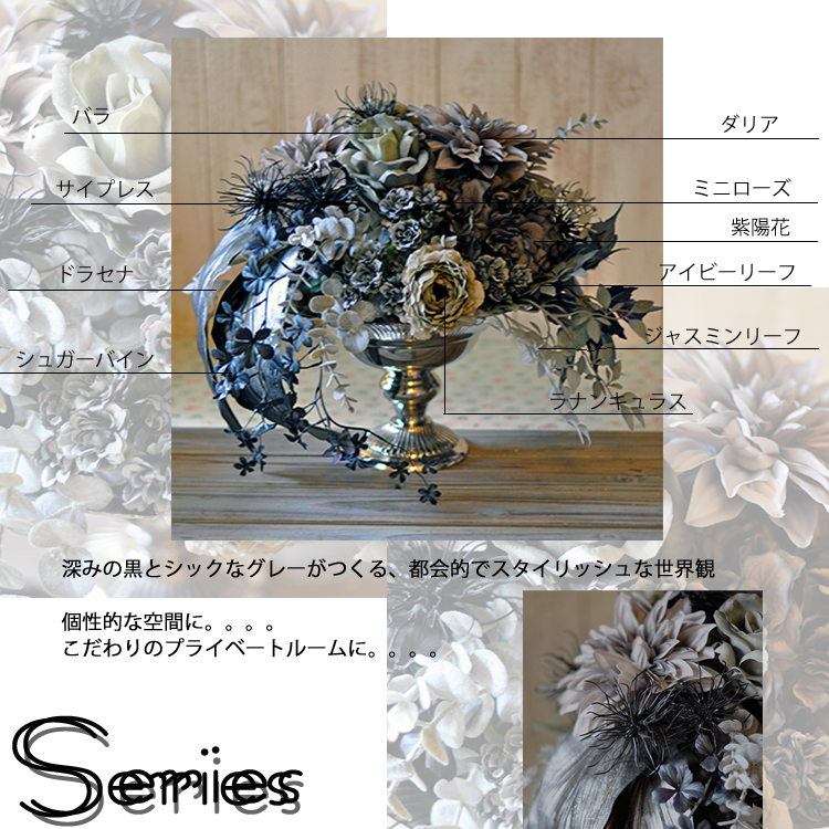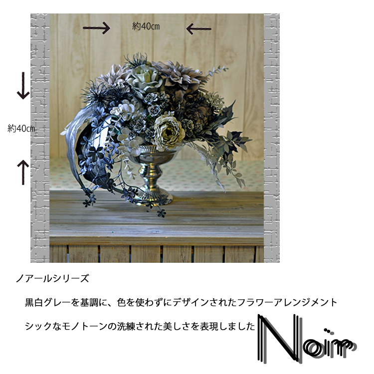 ノアールシリーズの最新作! 黒白グレーのモノトーンカラーのみでアレンジされたアーティフィシャルフラワーアレンジメント。 ノアールシリーズでは、花のもつ華やかさを、あえて色を使わず表現しています。生花では実現できない、アーティフィシャルフラワーならではの洗練された都会的なデザインです。