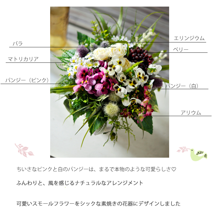 マトリカリアやミニバラなどのスモールフラワーと、ひらひらとちいさな花びらが可愛いパンジーをピンクと白の2種類アレンジメント。 ふんわりと風を感じる、ナチュラルで可愛らしさいっぱいのアレンジメントです。