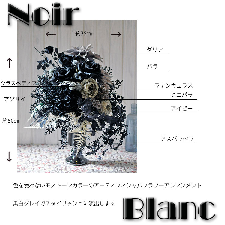 モノトーンで統一された空間も華やかに。色を使わず表現する黒(ノアール)を基調としたノアールシリーズのモノトーンアレンジ。 アーティフィシャルフラワーならではの大輪で豪華なお花を使用した存在感のあるアレンジメントです。個性的な空間に、プライベートスペースにぜひどうぞ。