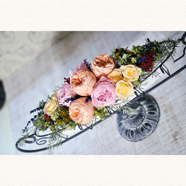 とても大きな芍薬咲きのバラを使い豪華に仕上げたプリザーブドフラワーアレンジメント。