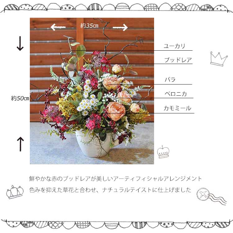 | 商品の色は掲載写真と多少異なる場合がございます。 生花ではありませんので水やりの必要はありません。高温多湿・直射日光を避けて飾ってください。 ※花材は仕入れの状況により変わる場合があります。 |