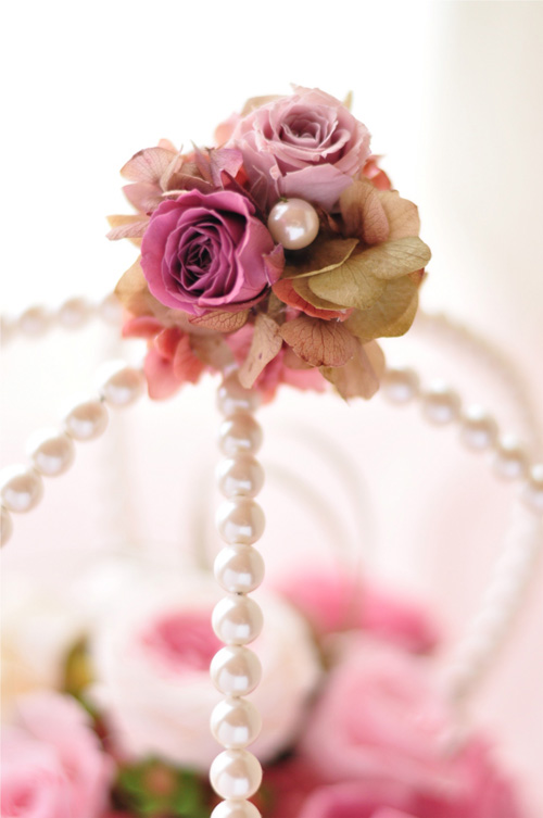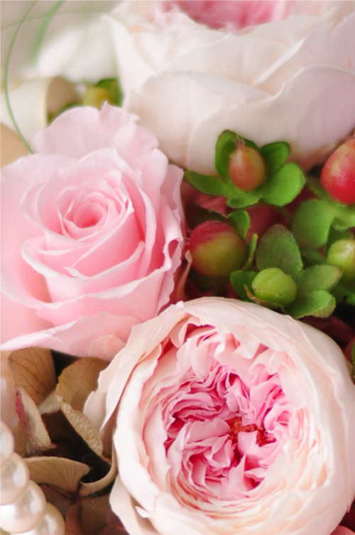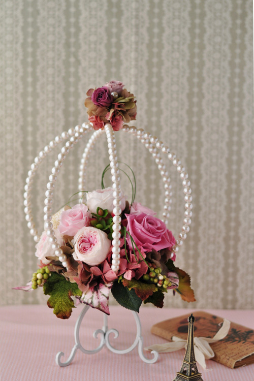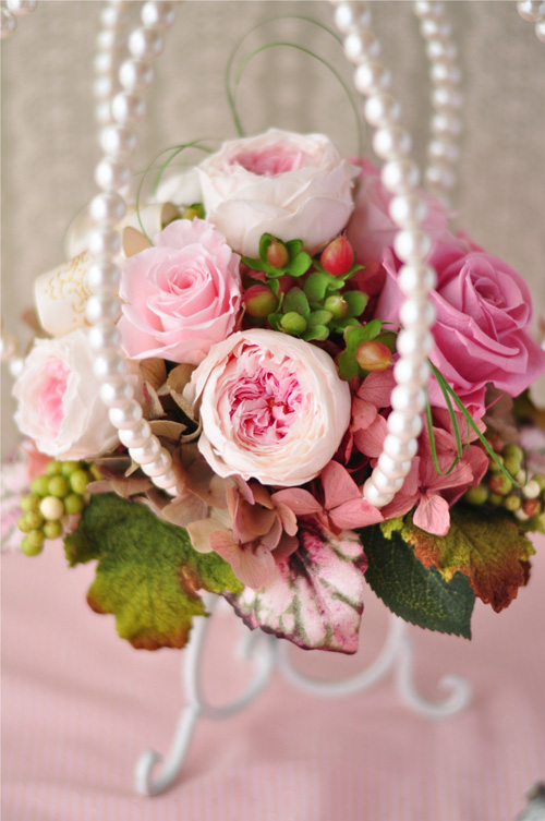 パールビーズの籠の中に数種類のピンクローズをアレンジしました。
