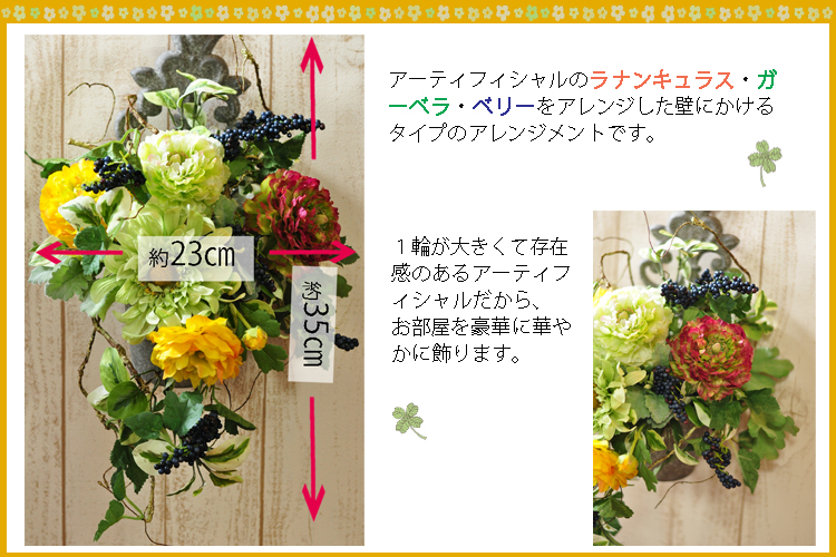 アートフラワー&アートグリーンを使った壁飾りです。 爽やかなイエローのラナンキュラスとガーベラのグリーンがとてもナチュラルでおしゃれな印象です。