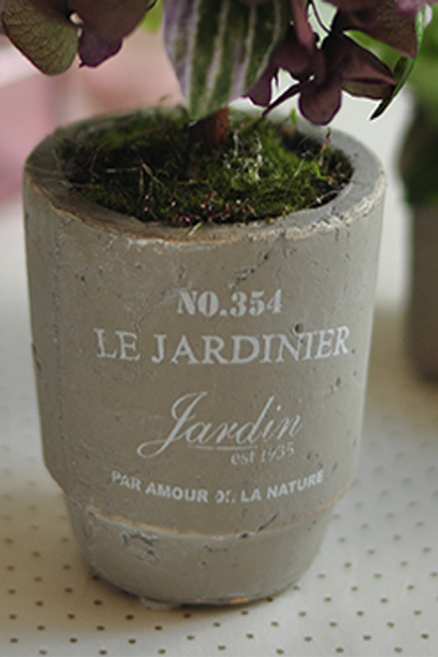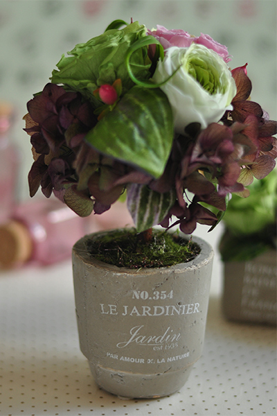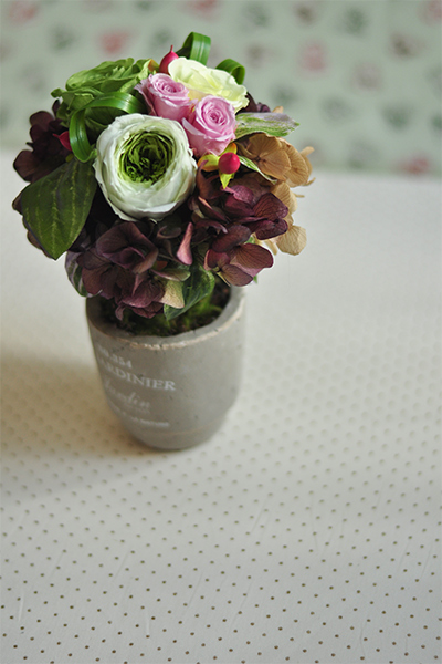 アンティーク風な素焼きの器でかわいいサイズのアレンジです。