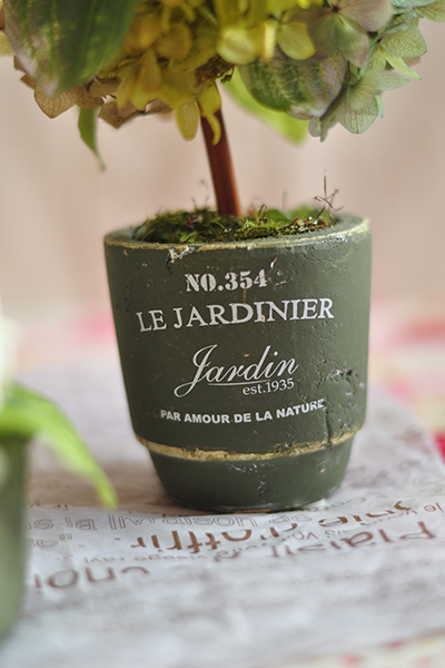 アンティーク風な素焼きの器でかわいいサイズのアレンジです。