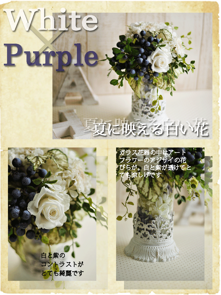 白と紫がガラスの花器から透けて見える爽やかな印象のプリザーブドフラワー&アートグリーンのアレンジメントです。