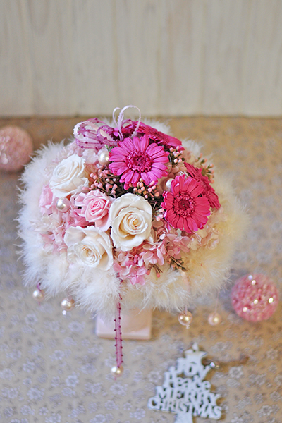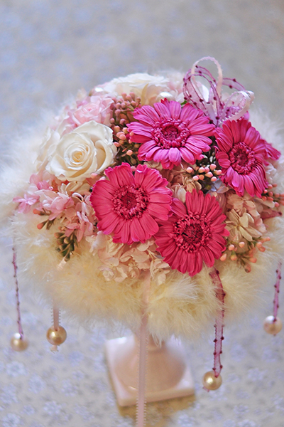 かわいいピンクガーベラとローズのキュートアレンジ。