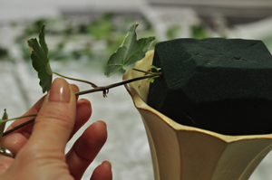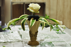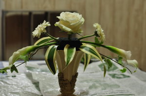 そして高さを決めるバラ。 真ん中の位置にすこし高さを出して挿します。 |