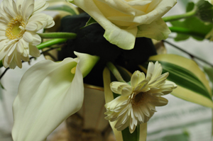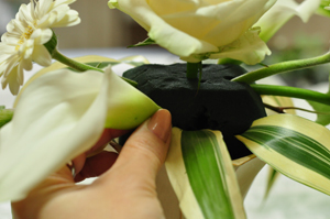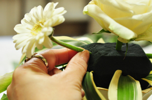 つぎにガーベラをバラとカラーの間に挿します。 |