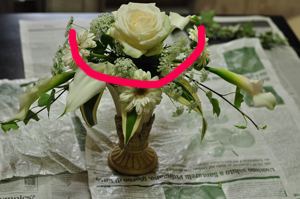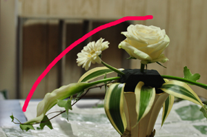 てっぺんのバラから、アイビーの先までをなだらかなカーブを描くようにつなぐラインの真ん中あたりにガーベラがくるように。 きれいな弓型に見えるかどうかはここにがポイントなので長さをよく見て挿してください |