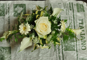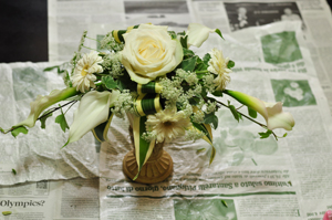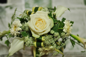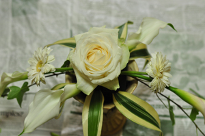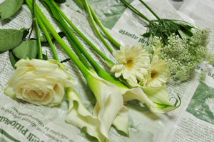 本日の花材です。 左から バラ 1本 カラー 4から5本 ガーベラ 4から5本 レースフラワー 1本 |
