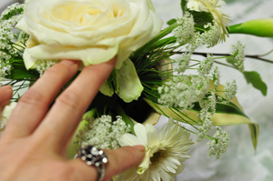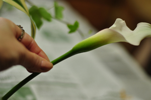 つづいてカラー。 カラーは茎がまっすぐですが、ゆっくりまげてやることでカーブを出すことができます。親指と人差し指でゆっくりなでるようにしならせます。 |