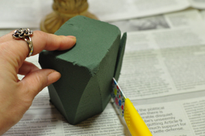 こんな感じ。 このように、角を面取りしてくださいね。 スポンジを花器より上に出すのは、横にも花を挿すためです。