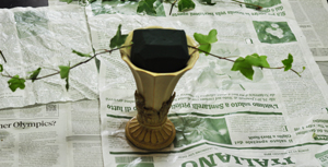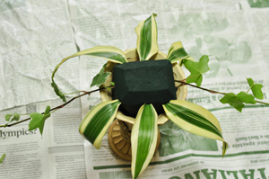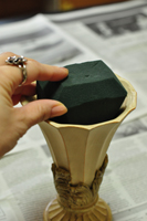 花器の太さに合わせて吸水スポンジをカットします。 今回は少し上に出るようにセットします。