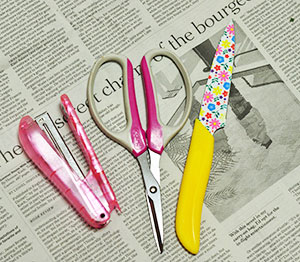 まずは、いつものように花ハサミとスポンジを切るナイフ、そしてホチキスです。 |
