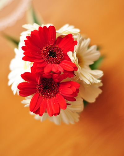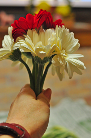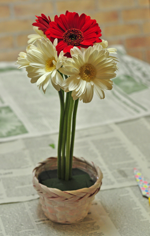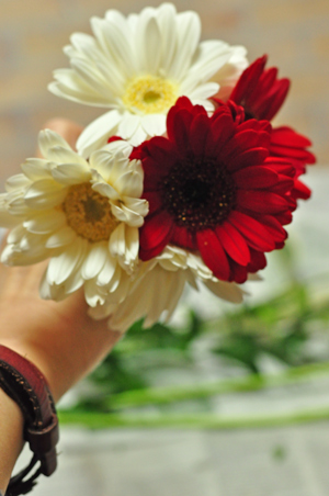 こんな感じです。 白いガーベラと合わせて持って、形を整えます。 上から見て丸い感じになるように |