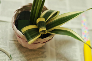 ガーベラの根元に挿していきます。 サンデリアーニの葉をあと2枚そのまま挿します。 |