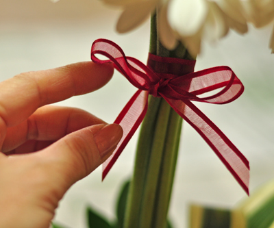 ガーベラの茎を、リボンで束ねます。 可愛く蝶々結びで。 |