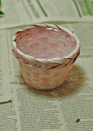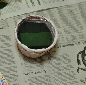 このようなカゴの場合は、水がもれますので、専用の透明のカップをセットします。 なければセロファンをカットして敷いてくださいね。 吸水スポンジをカットしてセットします。 少し低めにカットしてください。